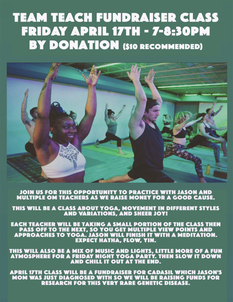 April 17th class will be a fundraiser for CADASIL which Jason’s mom was just diagnosed with so we will be raising funds for research for this very rare genetic disease.